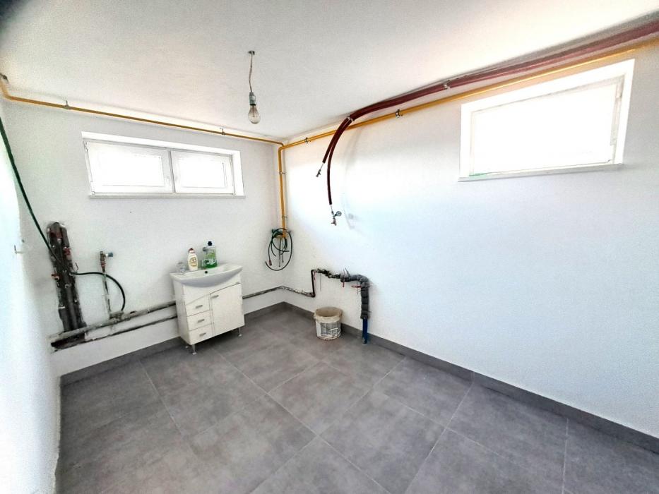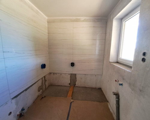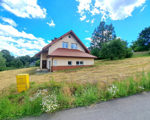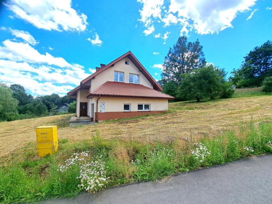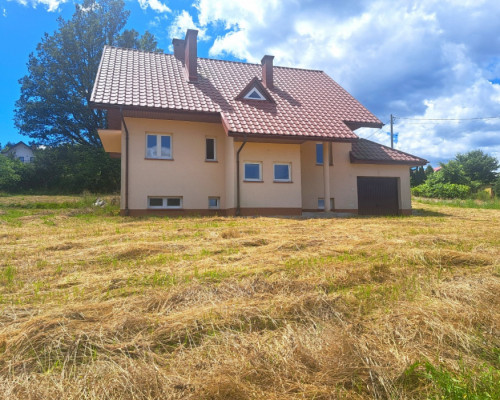 Dom posiada dwie kondygnacje mieszkalne: parter i poddasze użytkowe oraz dodatkowe podpiwniczenie o powierzchni 37 mkw. Budynek został oddany do użytkowania w 2018 roku. Zbudowany z pustaka, kryty blachodachówką, wyposażony w białe okna PCV i drzwi wejściowe antywłamaniowe. Na podłogach wylewki betonowe, na ścianach białe tynki. Na parterze przewidziano wiatrołap, przedpokój, salon, otwartą kuchnię ze spiżarką, pokój, garderobę, łazienkę, garaż, taras. Na piętrze: 3 sypialnie, łazienka, garderoba, przedpokój z klatką schodową, balkon. Media: prąd, gaz, wodociąg i kanalizacja.